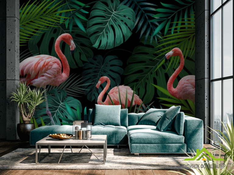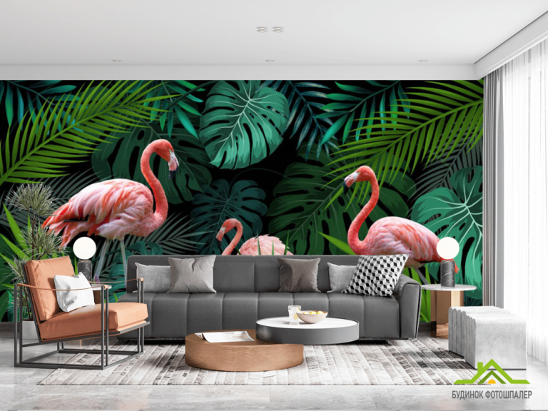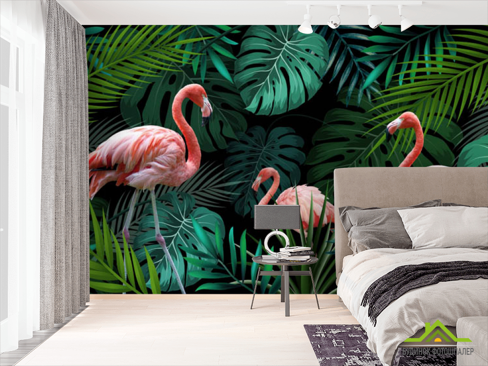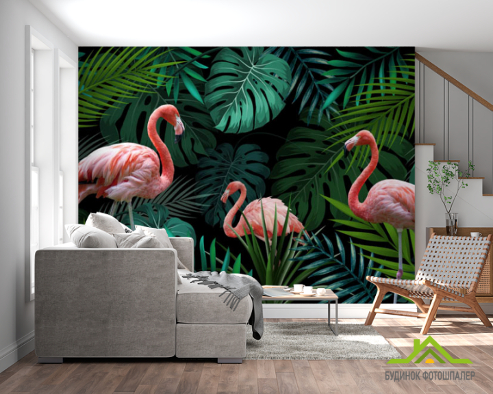 Фотошпалери фламінго на тропічних листках Фотошпалери фламінго на тропічних листках