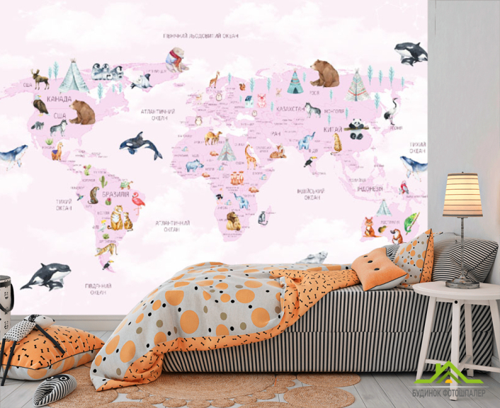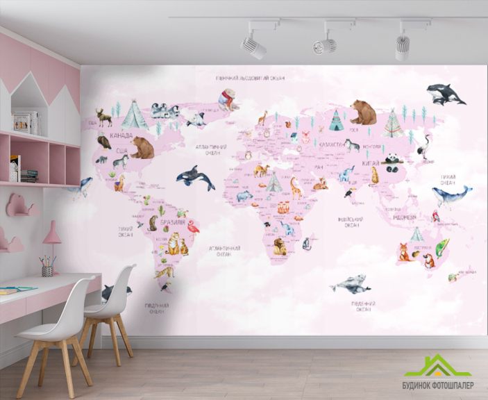 Фотошпалери карта дитяча з хмарками українською мовою в рожевому кольорі.