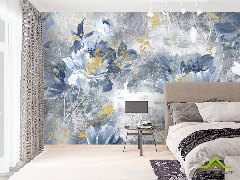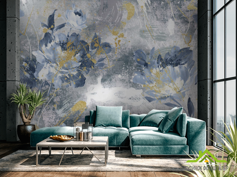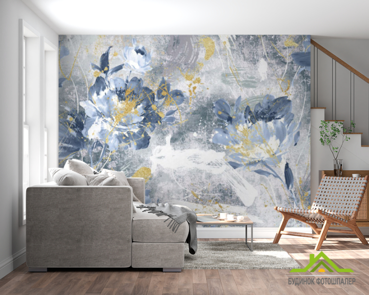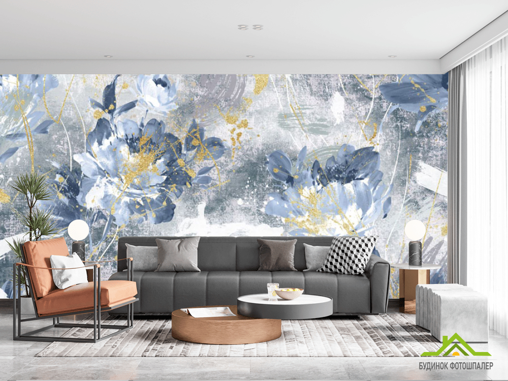 Фотошпалери дизайнерські квіти з золотом сині.