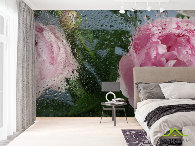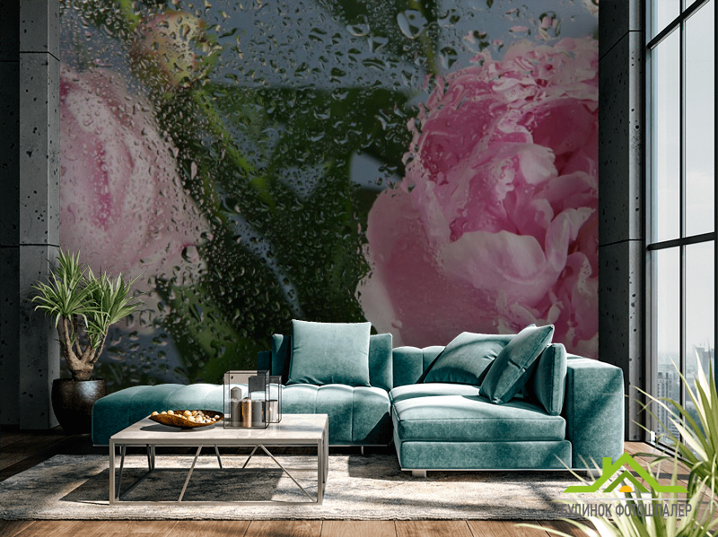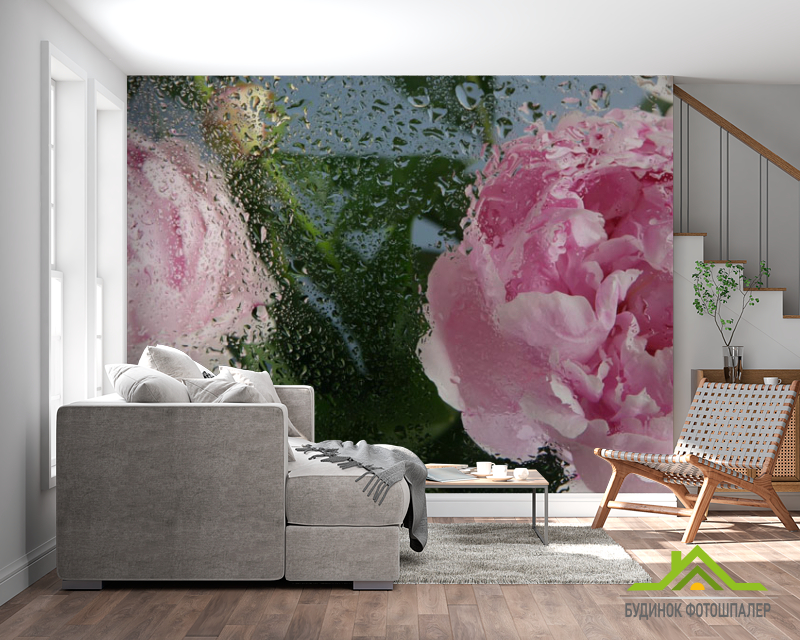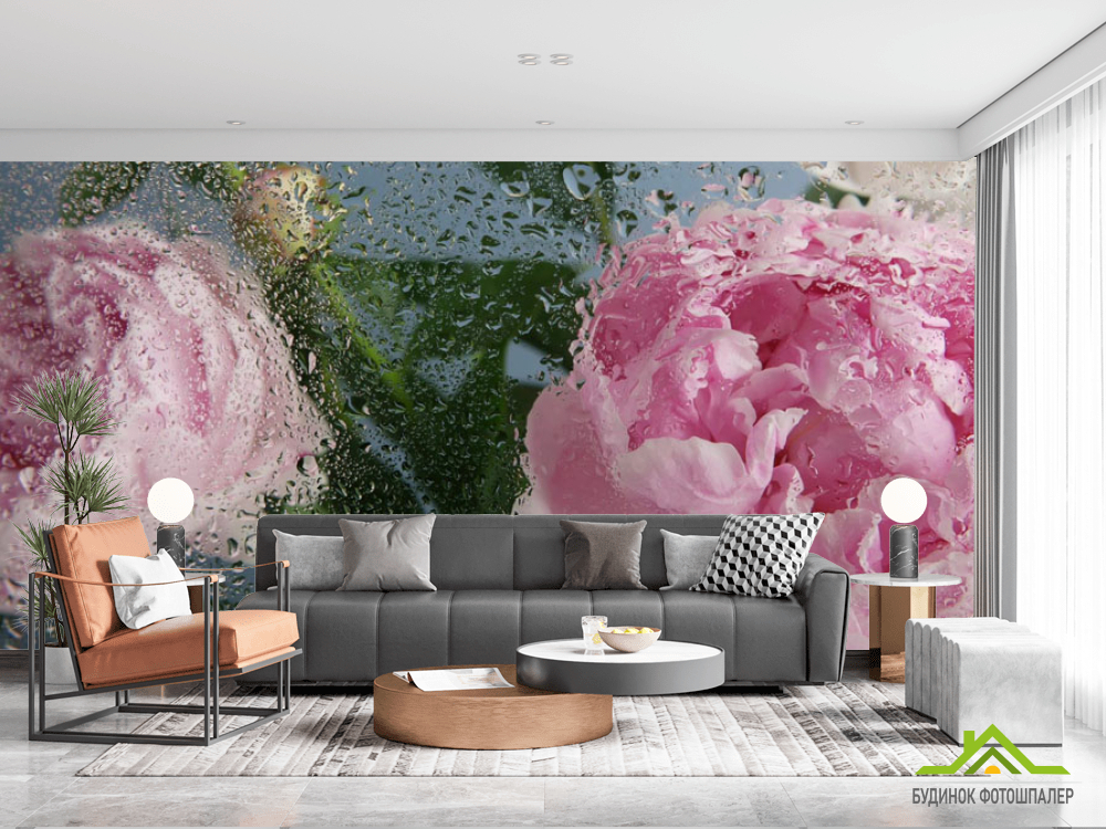 Фотошпалери Рожеві півонії з краплями дощу