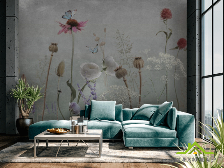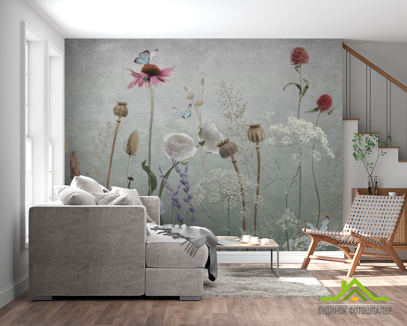 Фотошпалери польові дизайнерські квіти сірі Фотошпалери польові дизайнерські квіти сірі