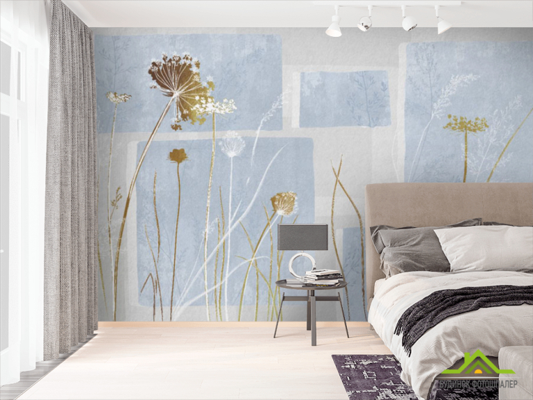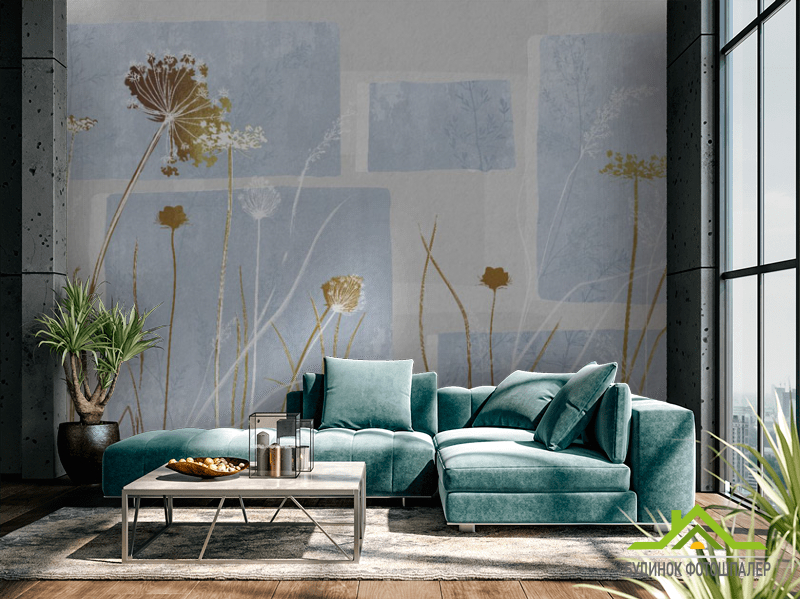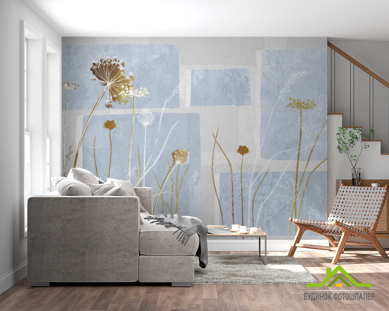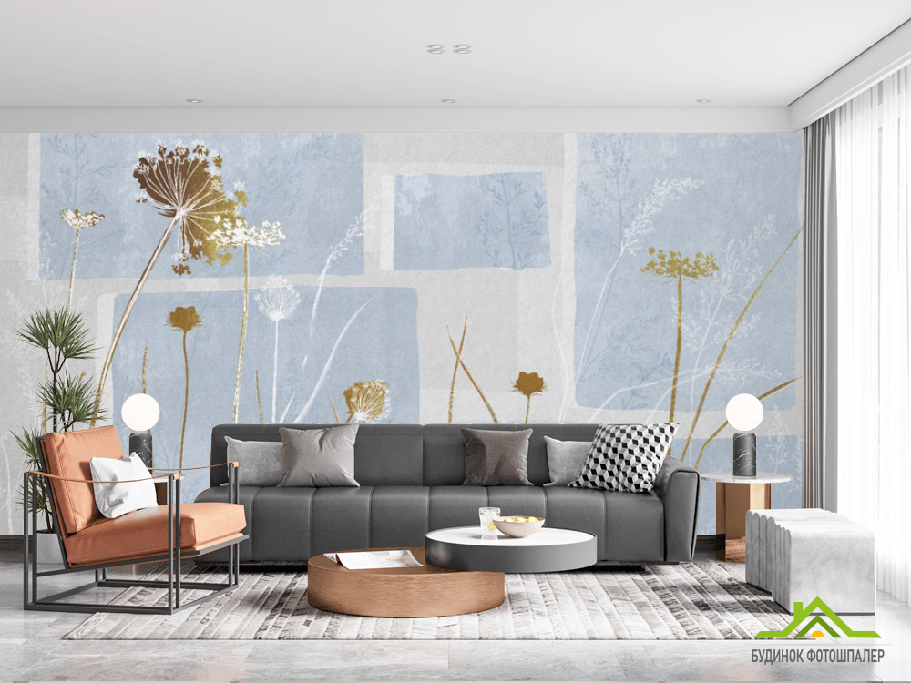 Фотошпалери сухоцвіти на синьому дизайнерському тлі.